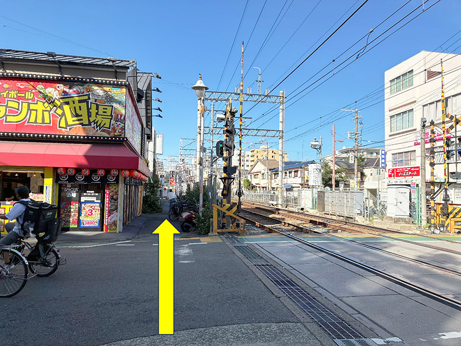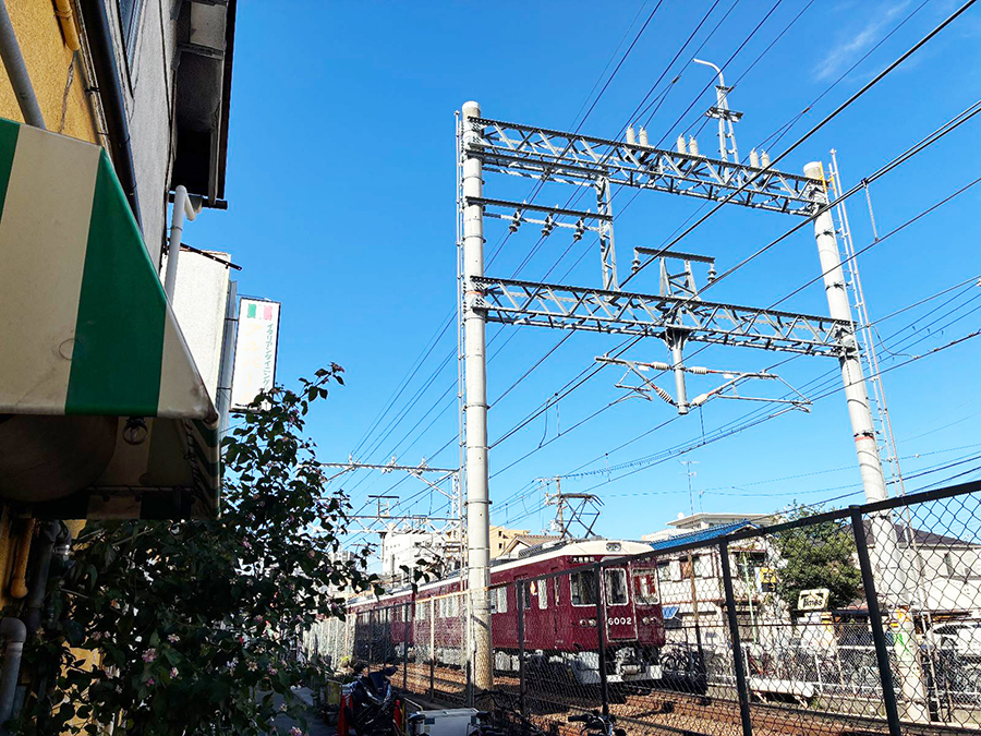 お店の前にて。一つ向こうのレールを走る阪急電車ですらこの距離!