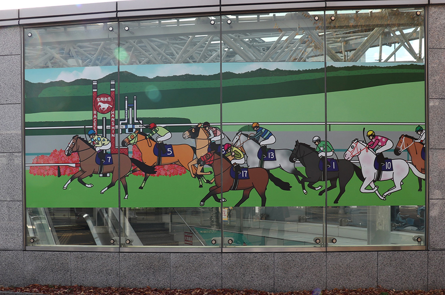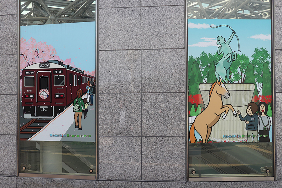 仁川駅の改札を出ると、早速目に飛び込んできたのは阪急電車と馬が描かれた大きなイラストが出迎えてくれました。駅前からすでに「阪急×競馬」がコラボムードです。
